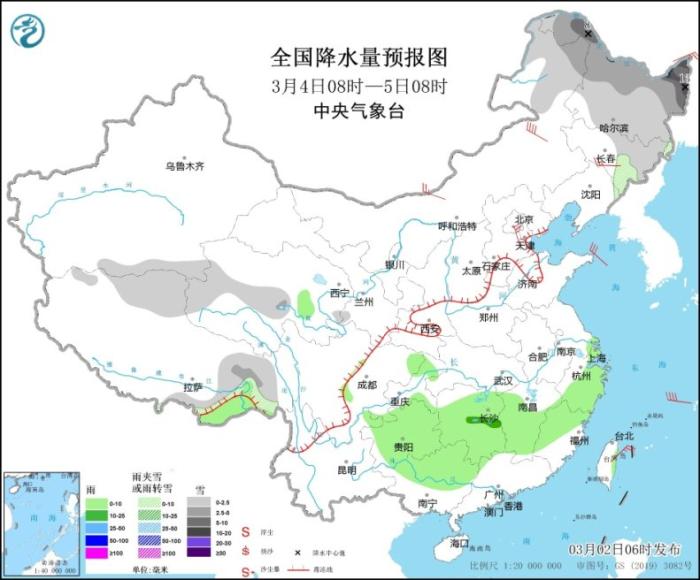 全國降水量預(yù)報圖(3月2日08時-3日08時)