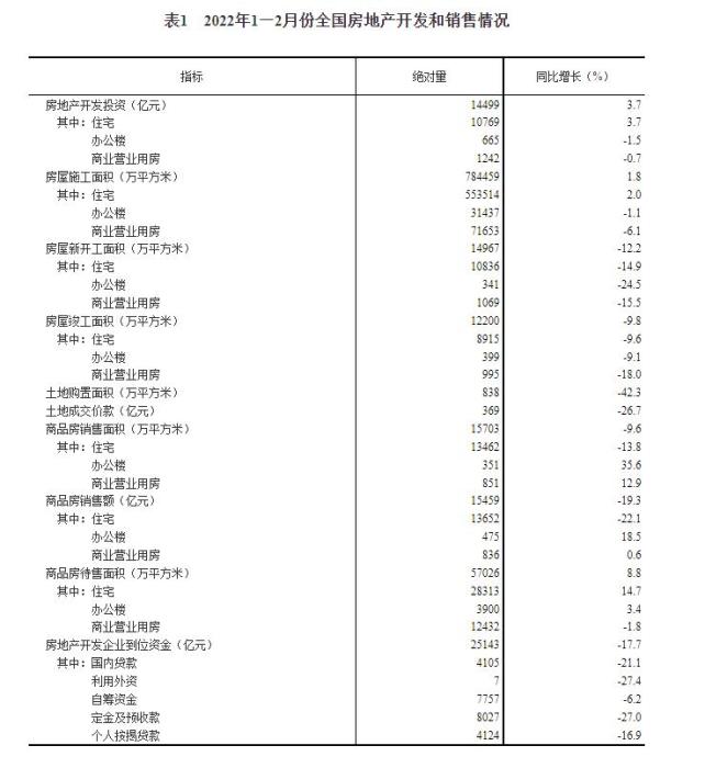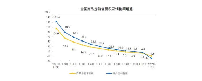 1—2月份,商品房銷(xiāo)售面積15703萬(wàn)平方米,同比下降9.6%,其中,住宅銷(xiāo)售面積下降13.8%;商品房銷(xiāo)售額15459億元,下降19.3%,其中,住宅銷(xiāo)售額下降22.1%。