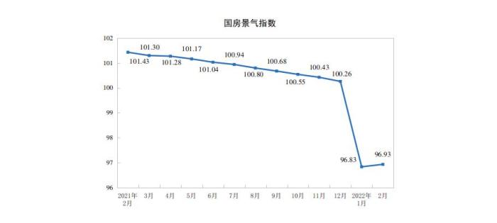 2月份,房地產(chǎn)開(kāi)發(fā)景氣指數(shù)(簡(jiǎn)稱“國(guó)房景氣指數(shù)”)為96.93。