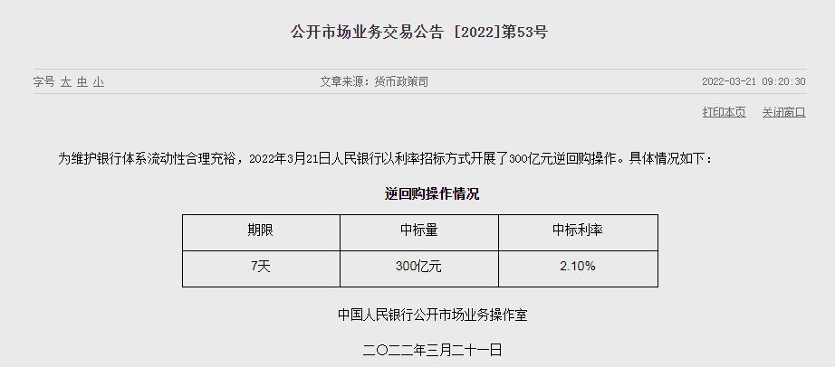 中新財(cái)經(jīng)3月21日電 3月21日,為維護(hù)銀行體系流動(dòng)性合理充裕,人民銀行以利率招標(biāo)方式開展了300億元7天期逆回購(gòu)操作,中標(biāo)利率為2.10%。(完)