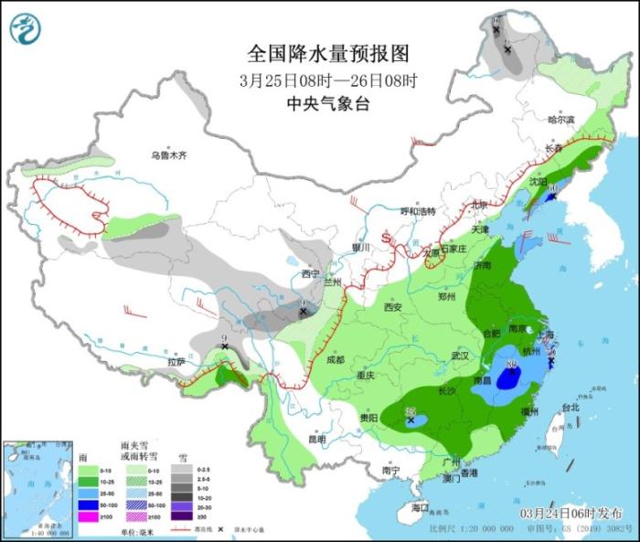 3月25日08時至26日08時,內(nèi)蒙古東北部、黑龍江北部、新疆南疆盆地、西藏北部、青海中南部、甘肅西南部、川西高原北部等地的部分地區(qū)有小到中雪或雨夾雪,其中,內(nèi)蒙古東北部、黑龍江西北部、西藏東部等地的部分地區(qū)有大雪(5~9毫米)。吉林東南部、遼寧東部、山東中東部、江淮、江南大部、貴州東南部、華南北部等地的部分地區(qū)有中到大雨,其中,遼寧東部、江西北部、浙江西南部、福建西北部等地的部分地區(qū)暴雨(50~80毫米)。內(nèi)蒙古中西部、遼東半島、西藏北部、青海南部、陜西北部、山東半島、浙江北部等地的部分地區(qū)有4~6級風(fēng)(見圖3)。