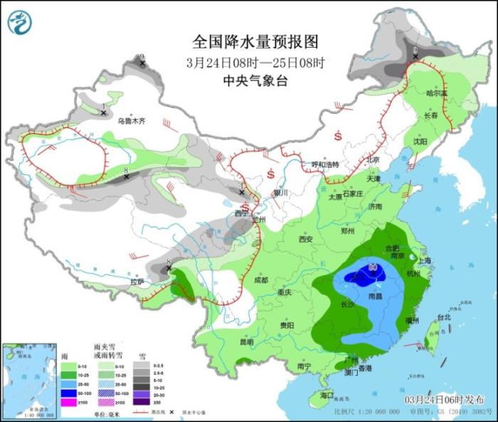 3月24日08時至25日08時,內(nèi)蒙古東部、黑龍江北部和東部、新疆西北部和南部、西藏東北部、青海北部和東南部、甘肅河西和西南部等地的部分地區(qū)有小到中雪或雨夾雪,其中,內(nèi)蒙古東北部、黑龍江西部、新疆北疆北部和南疆盆地等地的部分地區(qū)有大雪(5~9毫米)。江淮大部、江漢東部、江南大部、華南中東部等地的部分地區(qū)有中到大雨,其中,安徽西南部、湖北東部、江西北部等地的部分地區(qū)暴雨(50~80毫米)。內(nèi)蒙古中西部、遼東半島、新疆南部、西藏北部、甘肅河西、寧夏中北部、山東半島等地的部分地區(qū)有4~6級風(fēng),其中,新疆東部、青海西北部等地的部分地區(qū)有6~7級風(fēng)(見圖2)。