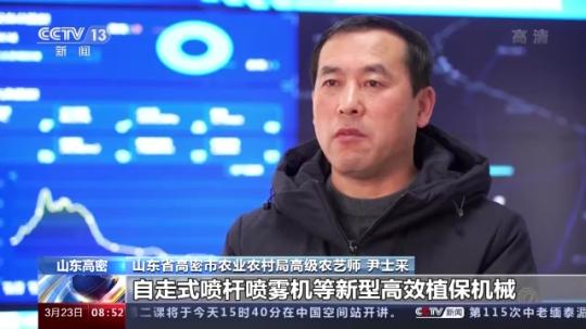 山東省高密市農(nóng)業(yè)農(nóng)村局高級(jí)農(nóng)藝師 尹士采:我們利用植保無(wú)人機(jī)、自走式噴桿噴霧機(jī)等新型高效植保機(jī)械,開(kāi)展小麥病蟲(chóng)草害統(tǒng)防統(tǒng)治,同時(shí)加強(qiáng)對(duì)農(nóng)戶、家庭農(nóng)場(chǎng)的指導(dǎo)服務(wù)。