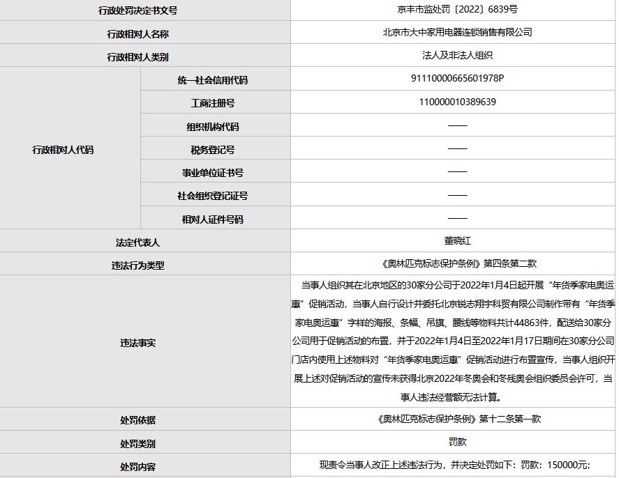 行政處罰書(shū)顯示,當(dāng)事人自行設(shè)計(jì)并委托北京銳志翔宇科貿(mào)有限公司制作帶有“年貨季家電奧運(yùn)惠”字樣的海報(bào)、條幅、吊旗、腰線等物料共計(jì)44863件,配送給30家分公司用于促銷活動(dòng)的布置,并于2022年1月4日至2022年1月17日期間在30家分公司門店內(nèi)使用上述物料對(duì)“年貨季家電奧運(yùn)惠”促銷活動(dòng)進(jìn)行布置宣傳,當(dāng)事人組織開(kāi)展上述對(duì)促銷活動(dòng)的宣傳未獲得北京2022年冬奧會(huì)和冬殘奧會(huì)組織委員會(huì)許可,當(dāng)事人違法經(jīng)營(yíng)額無(wú)法計(jì)算。(完)