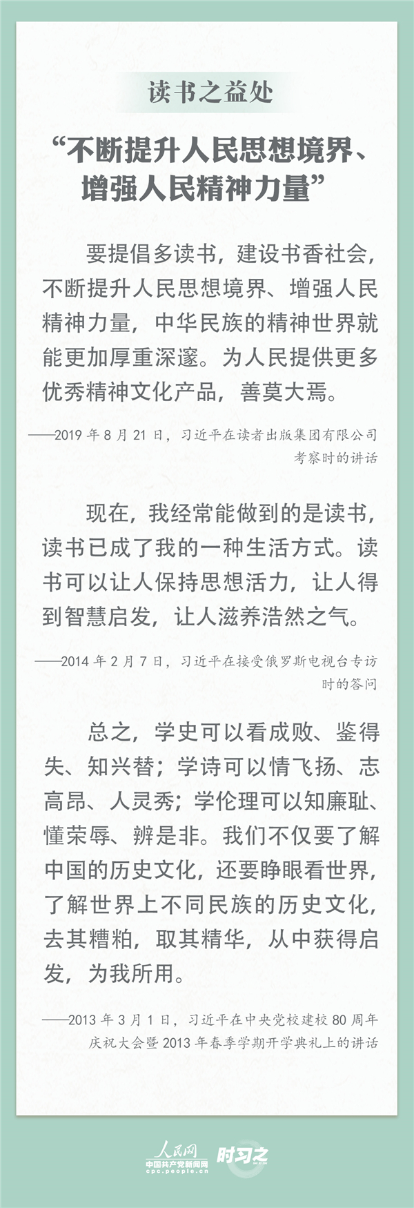 讀書滋養(yǎng)美好心靈。習(xí)近平總書記曾多次談及讀書的好處,“人民群眾多讀書,我們的民族精神就會厚重起來、深邃起來” 。4月23日是世界讀書日,跟習(xí)近平總書記學(xué)讀書之道,讓學(xué)習(xí)點亮生活,讓全民閱讀蔚然成風(fēng)。