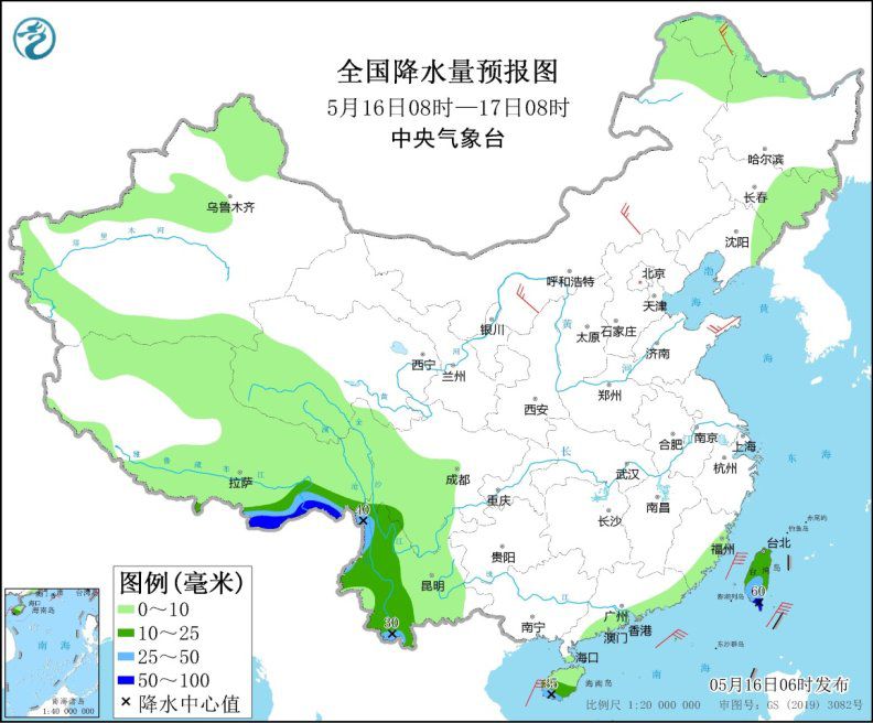 5月16日08時至17日08時,云南西部、西藏東南部、海南島南部、臺灣島等地部分地區(qū)有中到大雨,其中,西藏東南部、臺灣島南部等地部分地區(qū)有暴雨。黑龍江北部、內(nèi)蒙古中部、山東半島等地部分地區(qū)有4~6級風(fēng)。東海南部、臺灣海峽、南海北部、北部灣有6~7級、陣風(fēng)8級的風(fēng),其中,臺灣海峽風(fēng)力可達8級、陣風(fēng)9級。