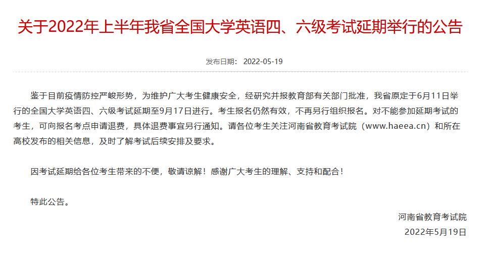 河南省全國(guó)大學(xué)英語(yǔ)四、六級(jí)考試延期至9月17日