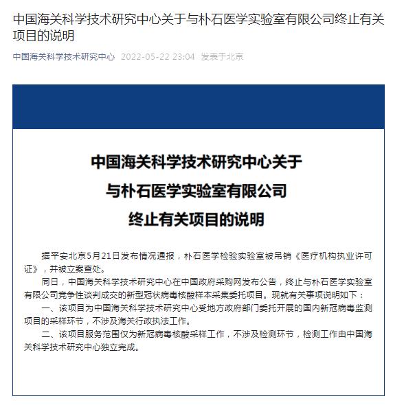 中國(guó)海關(guān)科學(xué)技術(shù)研究中心終止與樸石醫(yī)學(xué)實(shí)驗(yàn)室有關(guān)項(xiàng)目