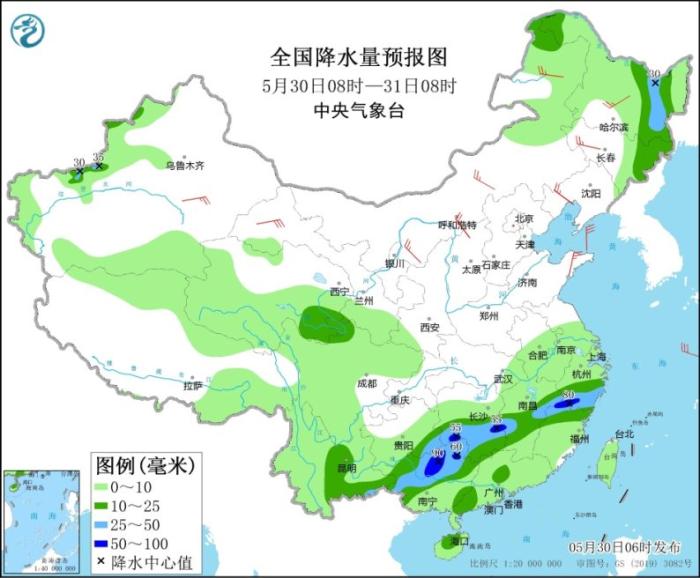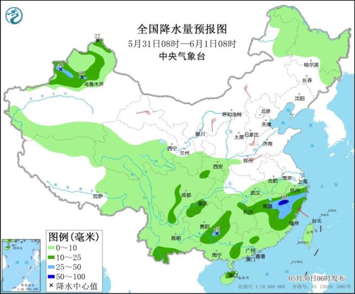 5月30日08時至31日08時,新疆西部、青藏高原北部和東部、內(nèi)蒙古東北部、黑龍江、吉林東部、江南大部、云南、貴州中南部、華南、蘇皖中南部等地的部分地區(qū)有小到中雨,其中,浙江南部、福建北部、江西中部、湖南中南部、廣西北部以及黑龍江東部、新疆南疆西部等地的部分地區(qū)有大雨,局地有暴雨(50~90毫米)。內(nèi)蒙古中東部、東北地區(qū)、山西北部、河北北部等地的部分地區(qū)有4~6級風(fēng)。黃海北部和東海北部海域有4~6級、陣風(fēng)7級的偏西風(fēng),東海南部和南海西南部海域有4~6級、陣風(fēng)7級的西南風(fēng)。
