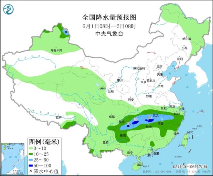 全國降水量預(yù)報圖(5月31日08時-6月1日08時)
