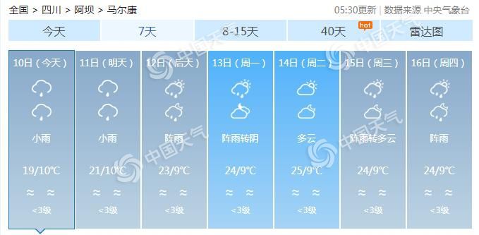 中央氣象臺預計,今起三天,馬爾康市多降雨,其中今明天有小雨,后天有陣雨。早晚氣溫較低,最低氣溫在10℃左右,最高氣溫19~23℃。
