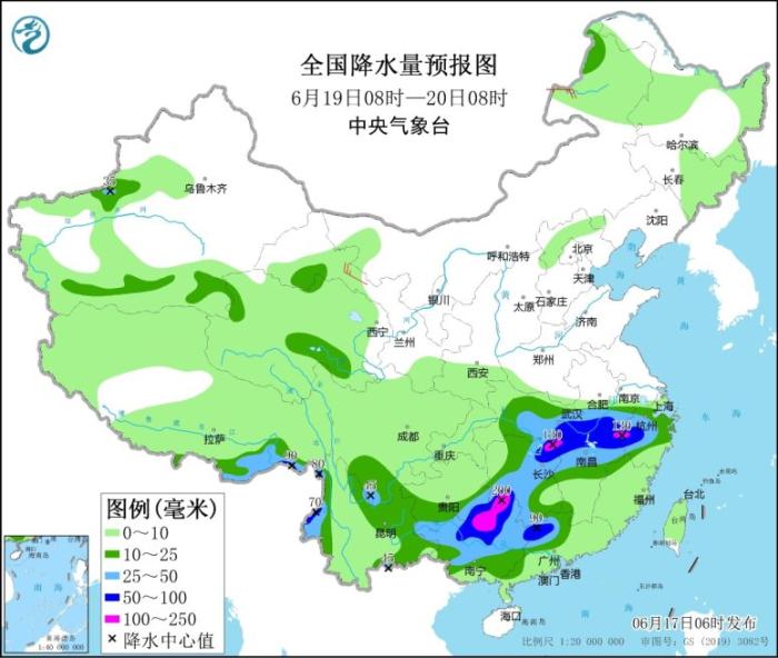 全國降水量預(yù)報(bào)圖(6月19日08時(shí)-20日08時(shí))