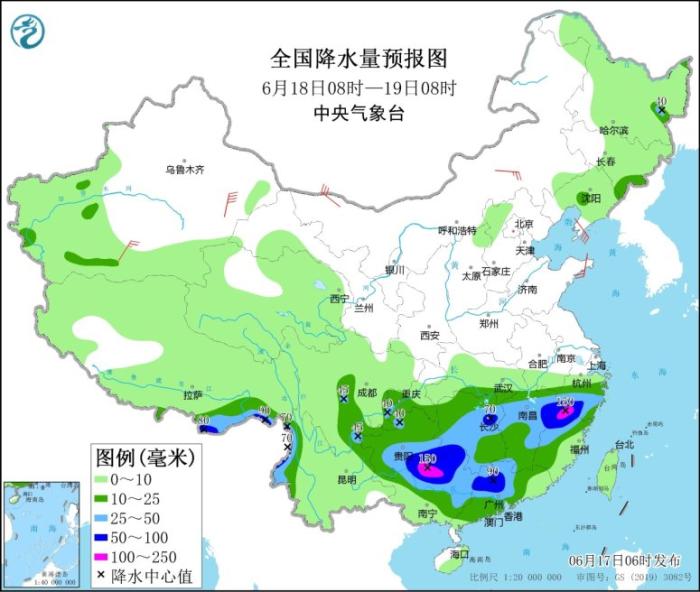全國降水量預(yù)報(bào)圖(6月17日08時(shí)-18日08時(shí))