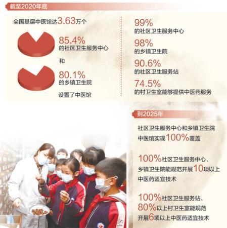 近年來,我國大力推進(jìn)基層中醫(yī)館建設(shè),完善覆蓋基層的中醫(yī)藥服務(wù)網(wǎng)絡(luò),暢通中醫(yī)藥服務(wù)基層群眾的“最后一公里”。國家中醫(yī)藥管理局公布的數(shù)據(jù)顯示,截至2020年底,全國基層中醫(yī)館達(dá)3.63萬個,85.4%的社區(qū)衛(wèi)生服務(wù)中心和80.1%的鄉(xiāng)鎮(zhèn)衛(wèi)生院設(shè)置中醫(yī)館。基層中醫(yī)藥服務(wù)可及性進(jìn)一步提高,99%的社區(qū)衛(wèi)生服務(wù)中心、98%的鄉(xiāng)鎮(zhèn)衛(wèi)生院、90.6%的社區(qū)衛(wèi)生服務(wù)站、74.5%的村衛(wèi)生室能夠提供中醫(yī)藥服務(wù)。