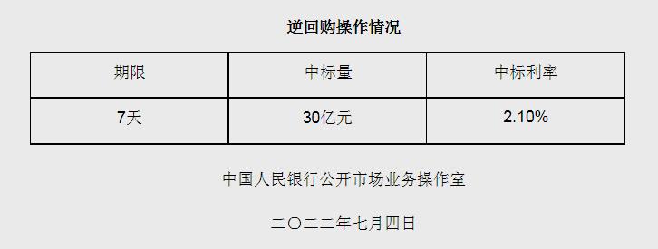 央行7月4日開展30億元逆回購操作 中標利率2.10%