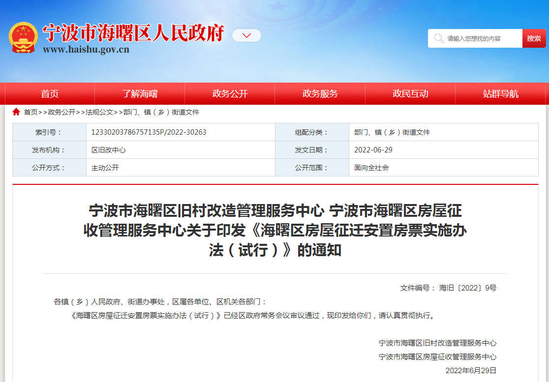 中新網(wǎng)7月5日電 據(jù)寧波市海曙區(qū)政府官網(wǎng),寧波市海曙區(qū)舊村改造管理服務(wù)中心、寧波市海曙區(qū)房屋征收管理服務(wù)中心近日印發(fā)《海曙區(qū)房屋征遷安置房票實(shí)施辦法(試行)》(下稱《實(shí)施辦法(試行)》)。