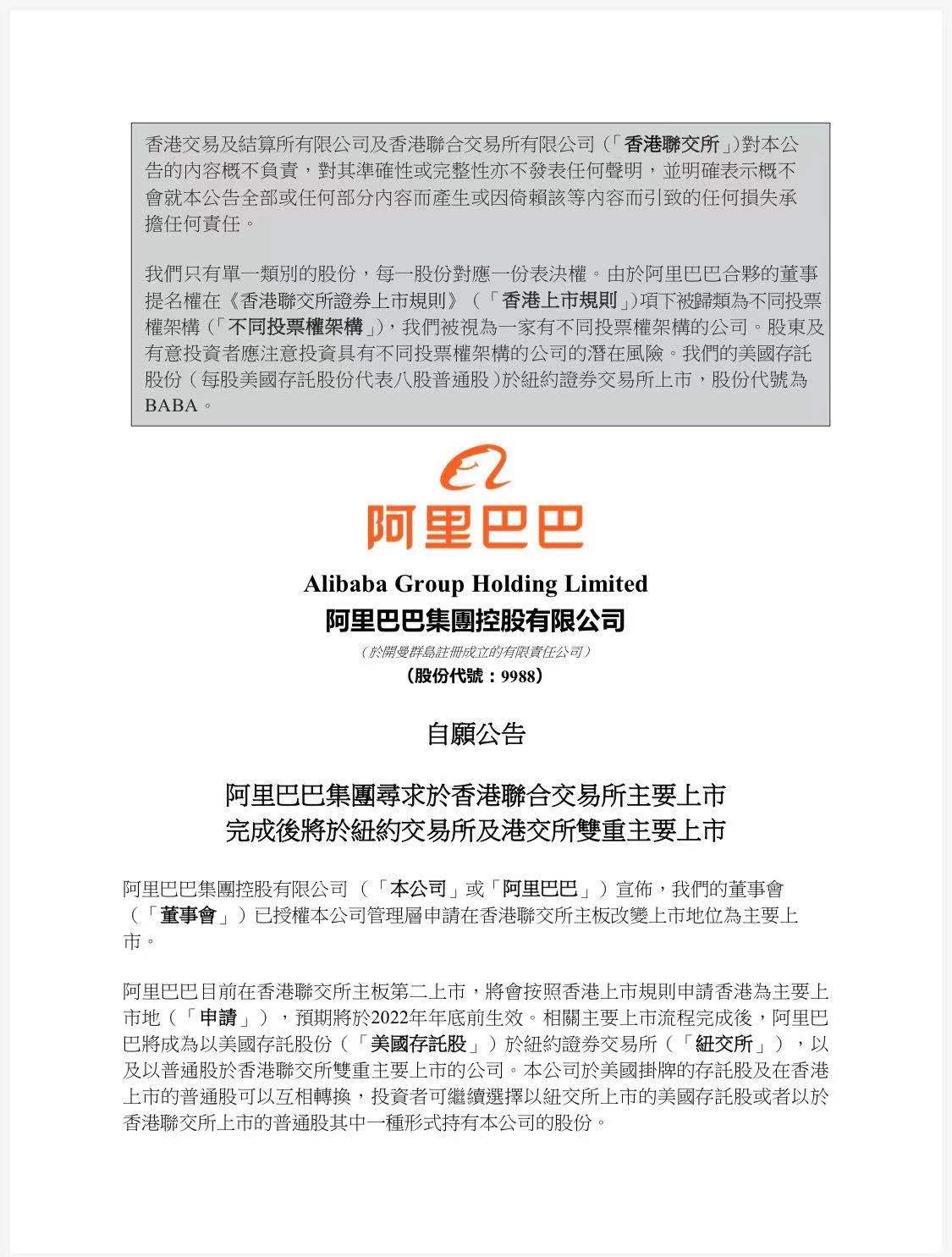 阿里巴巴目前在香港聯(lián)交所主板第二上市,將會(huì)按照香港上市規(guī)則申請(qǐng)香港為主要上市地,預(yù)期將于2022年年底前生效。相關(guān)主要上市流程完成后,阿里巴巴將成為以美國(guó)存托股份于紐約證券交易所,以及以普通股于香港聯(lián)交所雙重主要上市的公司。