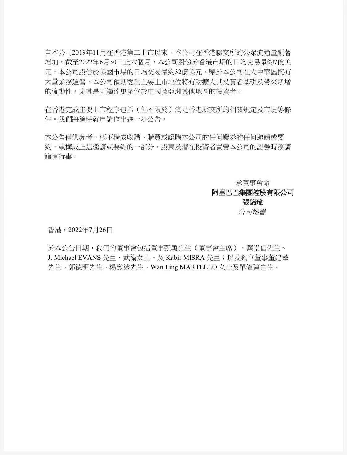 中新網(wǎng)7月26日電 阿里巴巴集團(tuán)控股有限公司7月26日在港交所發(fā)布公告,董事會(huì)已授權(quán)公司管理層申請(qǐng)?jiān)谙愀勐?lián)交所主板改變上市地位為主要上市。