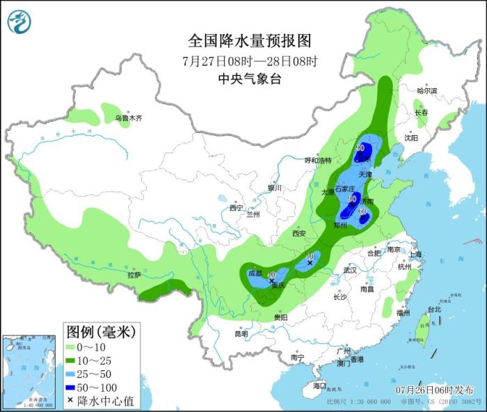 7月27日08時至28日08時,內(nèi)蒙古東部、華北大部、黃淮、江漢、西南地區(qū)東北部等地部分地區(qū)有中到大雨,其中,河北北部和南部、北京北部、天津北部、山東北部和南部、河南北部和東部、江蘇北部等地部分地區(qū)有暴雨(50~90毫米)(見圖3)。