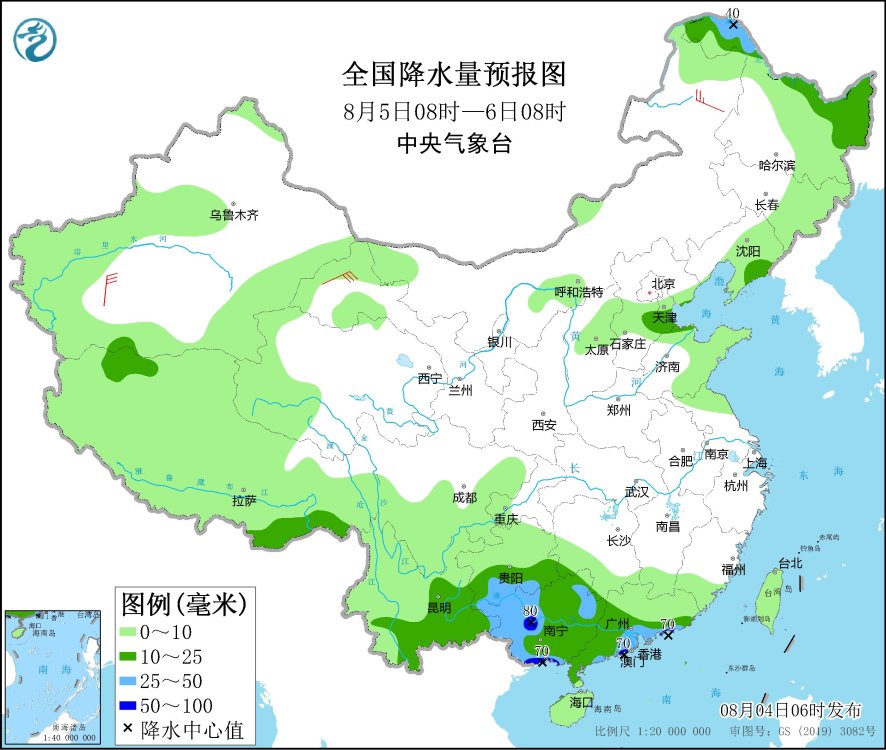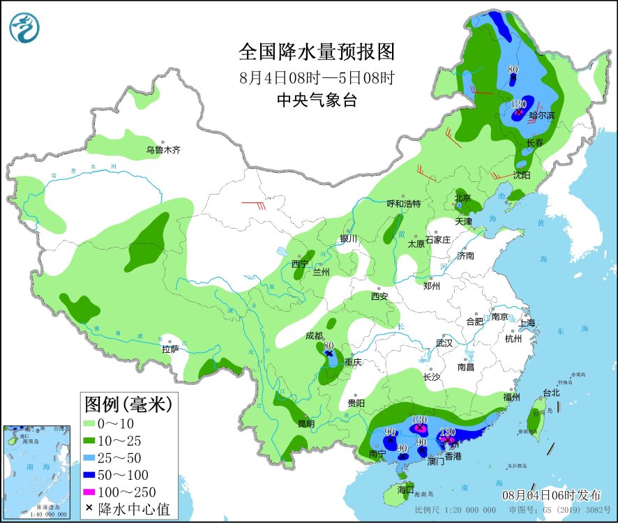 8月4日08時至5日08時,內(nèi)蒙古東部、遼寧北部、吉林中西部、黑龍江中西部、北京東部、天津北部、福建東南部、廣東大部、廣西大部、四川盆地南部、云南北部和南部、青海東部等地有中到大雨,其中,吉林西部、黑龍江西部、廣東東南部和西部、廣西東部、四川盆地南部等地部分地區(qū)有暴雨,局地有大暴雨(100~130毫米)。甘肅西部、內(nèi)蒙古中東部等地部分地區(qū)有4~6級風(fēng)。