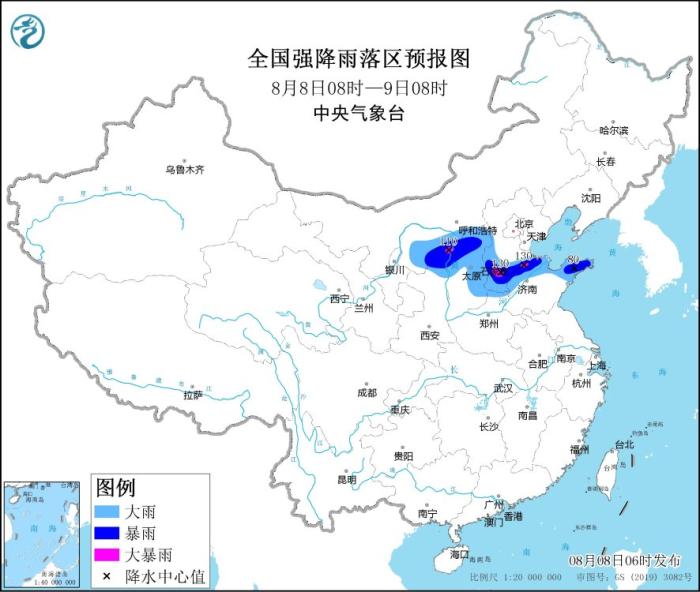 預(yù)計(jì),8月8日08時(shí)至9日08時(shí),內(nèi)蒙古河套地區(qū)、陜西北部、山西北部和東部、河北中南部、山東北部等地的部分地區(qū)有大到暴雨,其中,陜西北部、河北南部、山東西北部等地局地有大暴雨(100~130毫米)。上述部分地區(qū)伴有短時(shí)強(qiáng)降水(最大小時(shí)降雨量20~50毫米,局地可超過60毫米),局地有雷暴大風(fēng)等強(qiáng)對流天氣。中央氣象臺(tái)8月8日06時(shí)繼續(xù)發(fā)布暴雨藍(lán)色預(yù)警。