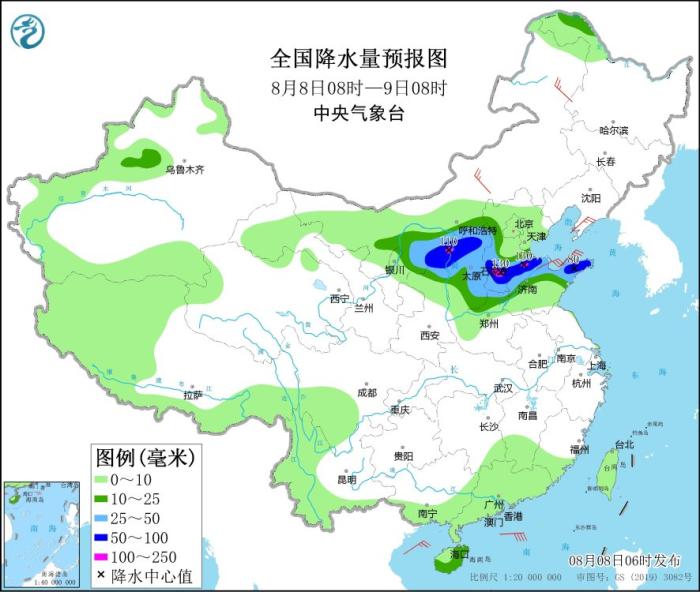 8月8日08時(shí)至9日08時(shí),內(nèi)蒙古河套地區(qū)、陜西北部、山西北部和東部、河北中南部、山東北部等地的部分地區(qū)有大到暴雨,其中,陜西北部、河北南部、山東西北部等地局地有大暴雨(100~130毫米)。內(nèi)蒙古中東部、遼東半島、山東半島等地部分地區(qū)有4~5級風(fēng)。