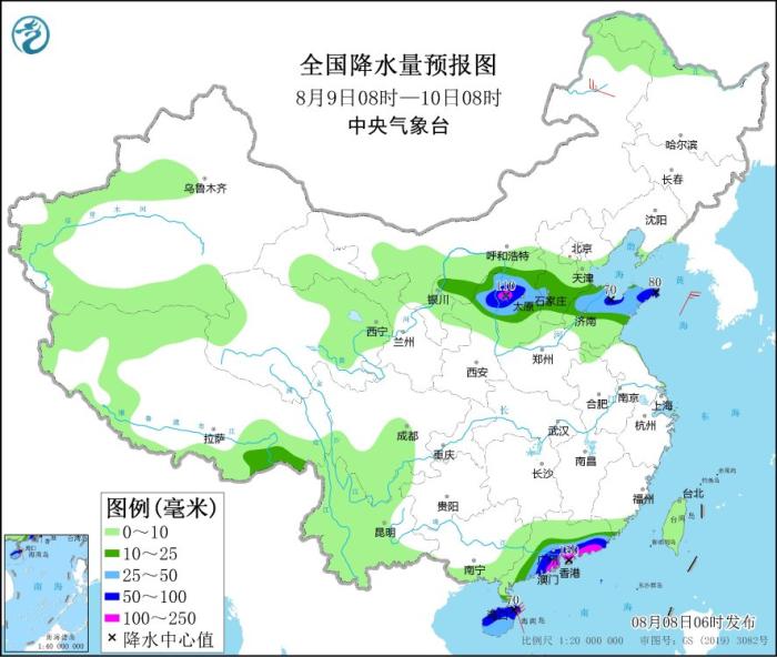 8月9日08時(shí)至10日08時(shí),內(nèi)蒙古河套地區(qū)、西藏東南部、寧夏北部、陜西北部、山西中北部、河北中南部、山東北部、廣東南部沿海、海南島等地部分地區(qū)有中到大雨,其中,陜西北部、山西中部、山東中東部、廣東南部沿海、海南島北部等地部分地區(qū)有暴雨或大暴雨(100~150毫米)。內(nèi)蒙古東北部部分地區(qū)有4~5級風(fēng)。南海東北部海域?qū)⒂?~7級、陣風(fēng)8級增大到7~8級、陣風(fēng)9級的東南風(fēng)。