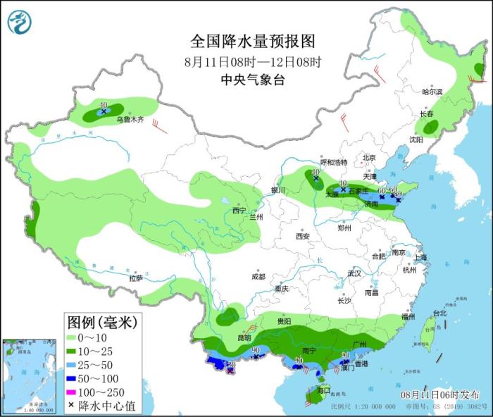 8月11日08時(shí)至12日08時(shí),云南南部、廣西南部、廣東西南部沿海以及山西中部、河北南部、山東中部等地部分地區(qū)有大到暴雨,其中,云南南部局地有大暴雨(100~120毫米)。內(nèi)蒙古中東部、新疆東部、云南中南部、廣西南部、廣東西南部沿海、海南島西部等地部分地區(qū)有4~6級風(fēng),局地風(fēng)力可達(dá)6~7級。