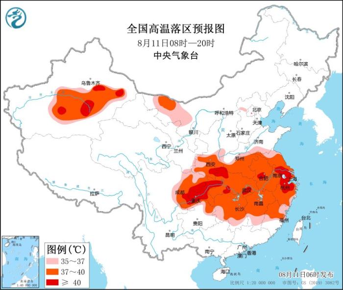 預(yù)計(jì)8月11日白天,新疆南疆盆地、內(nèi)蒙古西部、陜西中南部、河南中南部、安徽、江蘇、上海、四川中東部、重慶、湖北、湖南、江西、浙江、福建中北部、貴州北部等地有35~39℃高溫天氣,其中,陜西東南部、湖北西部和南部、四川東部、重慶、江蘇南部、安徽中部、浙江北部等地的部分地區(qū)可達(dá)40℃以上。中央氣象臺8月11日06時(shí)繼續(xù)發(fā)布高溫橙色預(yù)警。