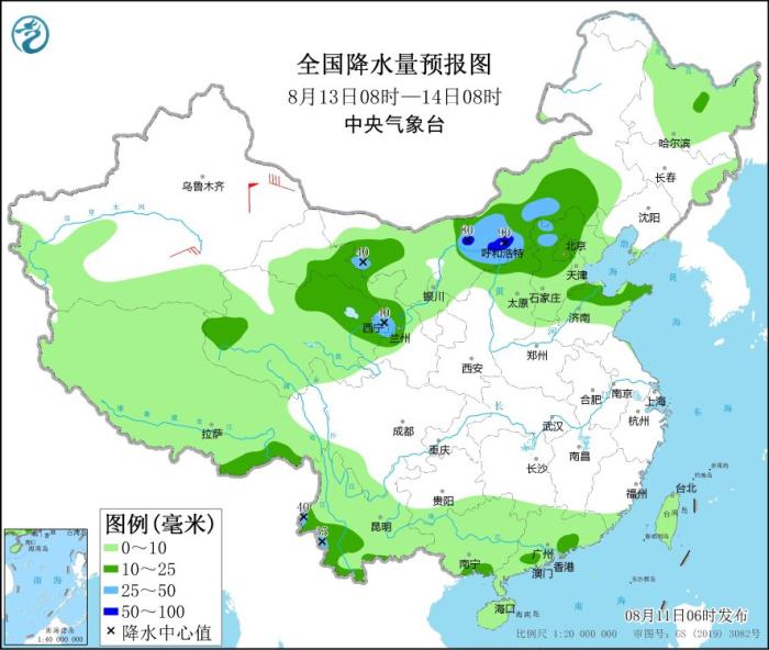 8月13日08時(shí)至14日08時(shí),內(nèi)蒙古中西部和東南部、西藏東南部、甘肅中部、青海東北部、華北中北部、山東北部、云南南部等地部分地區(qū)有中到大雨,其中,內(nèi)蒙古河套地區(qū)等地局地有暴雨(50~90毫米)。新疆東部和南疆盆地部分地區(qū)有4~6級風(fēng)。