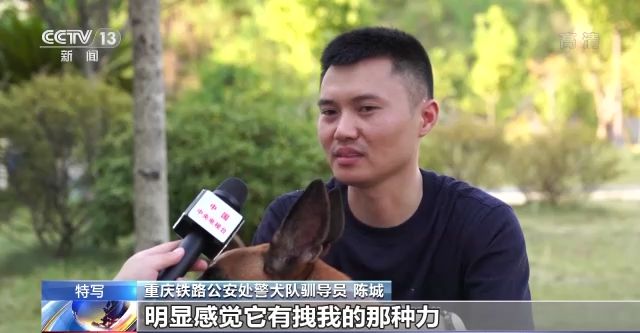重慶鐵路公安處警犬隊馴導(dǎo)員 陳城:有一次我們出去找一個人的時候,在山林里搜救,我在行進(jìn)的途中不小心差點摔下去了,因為拽著(閃電的)警繩,明顯感覺它有拽我的那種力,把我拖上去的感覺挺感動的,當(dāng)時內(nèi)心有一顫。