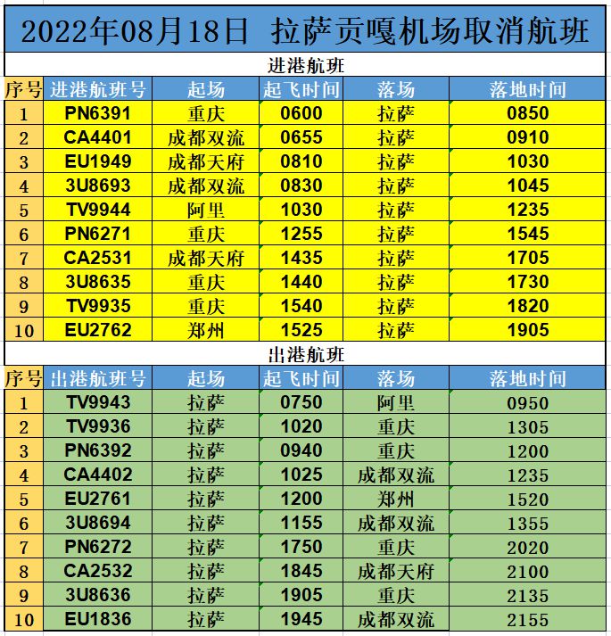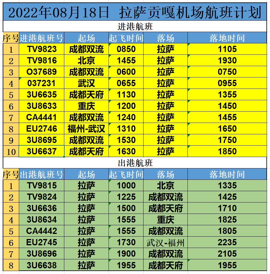 因公共安全原因,8月18日,拉薩貢嘎機(jī)場(chǎng)部分航班取消,計(jì)劃執(zhí)行進(jìn)出港航班18架次,分別為: