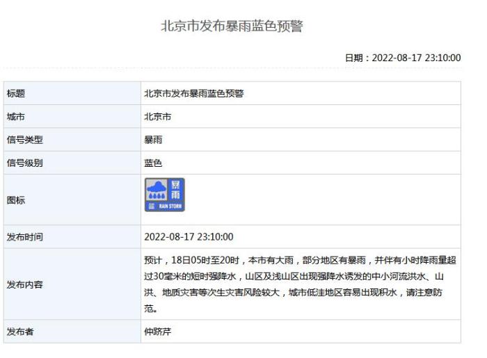 北京市發(fā)布暴雨藍色預警