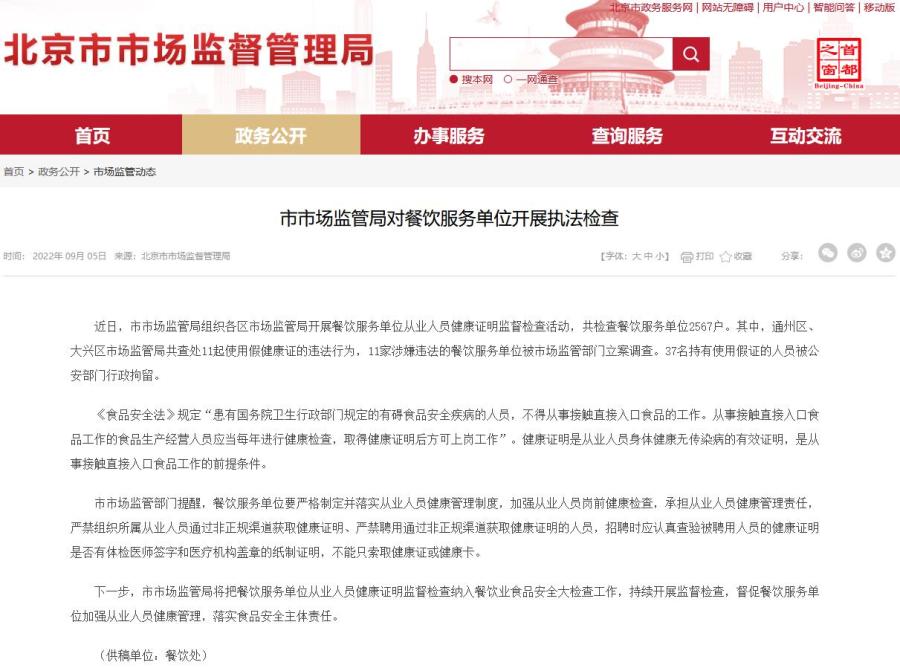 中新網(wǎng)9月5日電 據(jù)北京市市場監(jiān)督管理局網(wǎng)站5日消息,近日,北京市市場監(jiān)管局組織各區(qū)市場監(jiān)管局開展餐飲服務(wù)單位從業(yè)人員健康證明監(jiān)督檢查活動,共檢查餐飲服務(wù)單位2567戶。其中,通州區(qū)、大興區(qū)市場監(jiān)管局共查處11起使用假健康證的違法行為,11家涉嫌違法的餐飲服務(wù)單位被市場監(jiān)管部門立案調(diào)查。37名持有使用假證的人員被公安部門行政拘留。