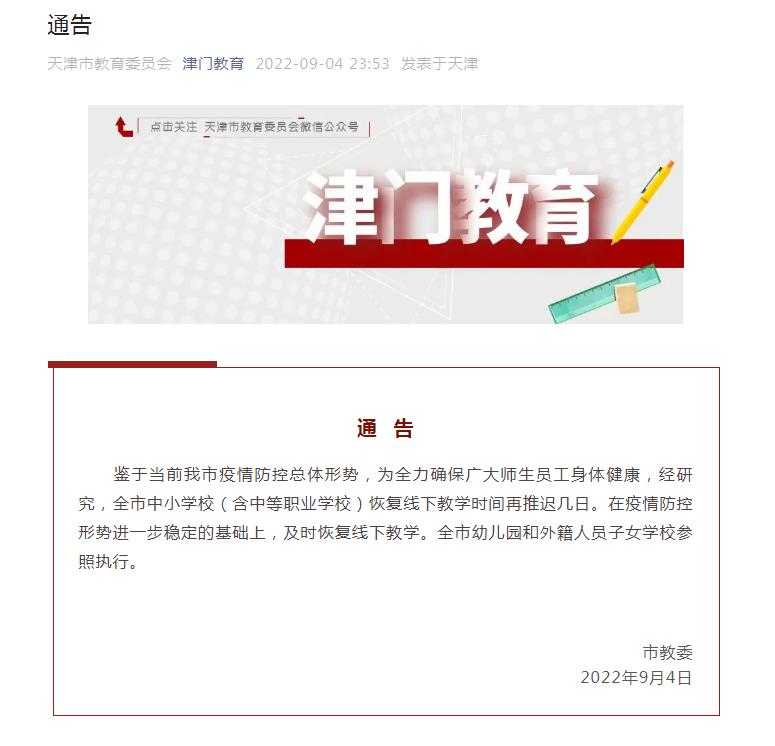 中新網(wǎng)9月5日電 天津市教育委員會(huì)4日晚在其官方微信發(fā)布通告稱,鑒于當(dāng)前天津市疫情防控總體形勢(shì),為全力確保廣大師生員工身體健康,經(jīng)研究,全市中小學(xué)校(含中等職業(yè)學(xué)校)恢復(fù)線下教學(xué)時(shí)間再推遲幾日。在疫情防控形勢(shì)進(jìn)一步穩(wěn)定的基礎(chǔ)上,及時(shí)恢復(fù)線下教學(xué)。全市幼兒園和外籍人員子女學(xué)校參照?qǐng)?zhí)行。