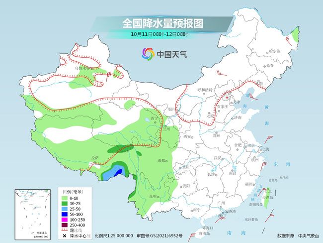 明天,西藏大部、青海大部、甘肅東部、四川大部、云南大部、新疆南部山區(qū)和天山山麓等地部分地區(qū)有小到中雨,其中,西藏東南部局地有大到暴雨。