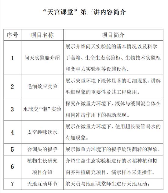 本次太空授課活動將繼續(xù)采取天地互動方式進行,3名航天員將在軌介紹展示中國空間站問天實驗艙工作生活場景,演示微重力環(huán)境下毛細效應(yīng)實驗、水球變“懶”實驗、太空趣味飲水、會調(diào)頭的扳手以及植物生長研究項目介紹,并與地面課堂進行互動交流,旨在傳播普及載人航天知識,激發(fā)廣大青少年對科學(xué)的興趣。