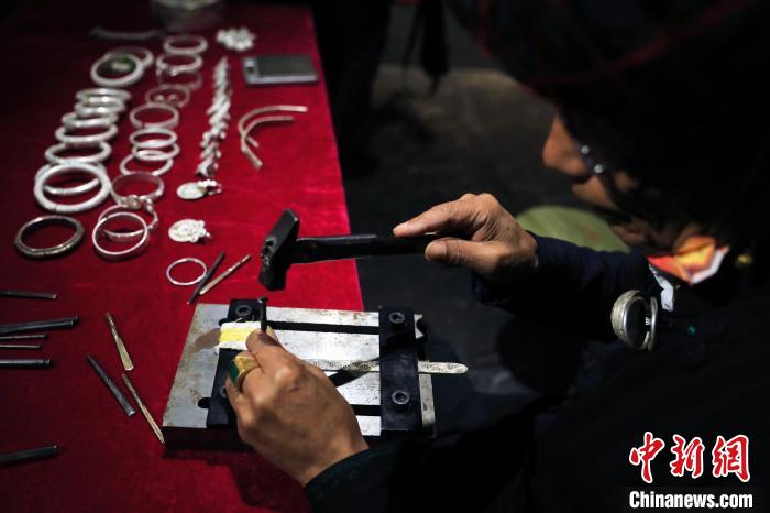 彝族銀飾制作技藝國家級(jí)非遺傳承人勒古沙日正在打制銀器?!⊥趵?攝