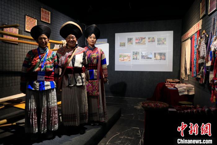 傈僳族火草織布技藝展區(qū),身著火草麻布百褶裙的熊國秀(左二)。 王磊 攝