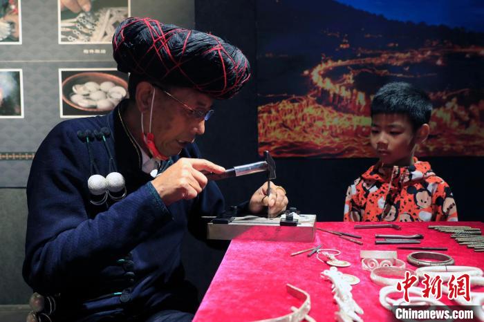 中新網(wǎng)涼山11月7日電 (王利文)“叮咚,叮咚……”6日,清脆的敲打聲從四川涼山民族體育場(chǎng)傳出,在“家園遺珍·時(shí)代新風(fēng)”非遺展演活動(dòng)中,彝族銀飾制作技藝國家級(jí)非遺傳承人勒古沙日正在打制銀器。鷹爪銀杯、鳳冠、胸牌……現(xiàn)場(chǎng)一件件閃亮精致的銀器均出自這位66歲老人之手。