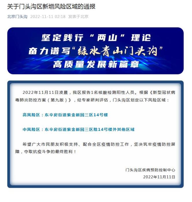 中新網(wǎng)11月11日電 據(jù)“北京門頭溝”微信公眾號消息,北京市門頭溝區(qū)疾病預防控制中心11日發(fā)布通報稱,2022年11月11日凌晨,門頭溝區(qū)報告1名核酸檢測陽性人員。根據(jù)《新型冠狀病毒肺炎防控方案(第九版)》,經(jīng)專家研判評估,門頭溝區(qū)劃定以下風險區(qū)域: