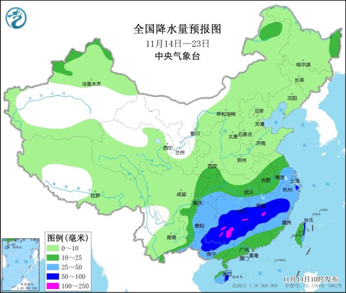 未來(lái)10天(11月14-23日),江南大部、華南西部及貴州等地累計(jì)降水量有25~40毫米,其中江南中南部及廣西中北部等地部分地區(qū)有50~80毫米、局部100毫米以上;上述地區(qū)降水量較常年同期偏多3~6成,局地偏多1倍以上;其余地區(qū)降水接近常年或偏少。