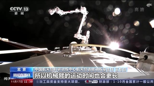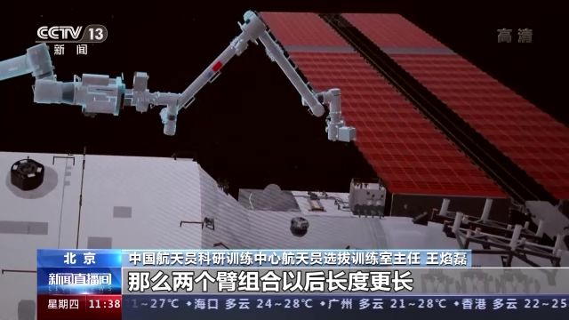 中國航天員科研訓練中心航天員選拔訓練室主任 王焰磊:我們首次使用兩個機械臂,就是大臂小臂形成組合臂的狀態(tài)下支持出艙活動任務。因為大家可以想象一下,單臂的長度已經(jīng)很長了,那么兩個臂組合以后長度更長,它的柔性、剛性等和我們單臂狀態(tài)下是有一些區(qū)別的。在這種情況下載人去支持完成出艙任務,也是我們做首次的一個驗證。