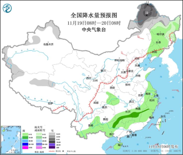 11月18日08時至19日08時,內(nèi)蒙古中東部、黑龍江西部、河北北部等地部分地區(qū)有小到中雪或雨夾雪,其中,內(nèi)蒙古東北部部分地區(qū)有中到大雪(5~8毫米)。華北西部、黃淮、江淮、江漢、江南、西南地區(qū)東部、華南西部等地部分地區(qū)有小到中雨,其中,廣西西北部、湖南東部、江西中部、浙江南部等地部分地區(qū)有大雨。內(nèi)蒙古中部部分地區(qū)有5~6級風(見圖2)。東海北部海域?qū)⒂?~7級、陣風8級的偏東風。