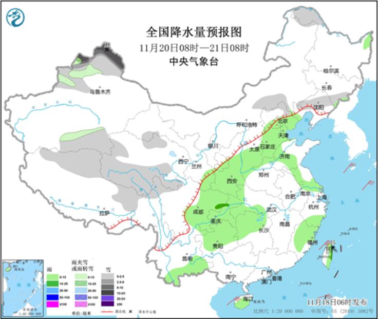 11月20日08時至21日08時,新疆北疆和南部、西藏北部、青海南部和西部等地部分地區(qū)有小到中雪或雨夾雪,其中,新疆北疆有大到暴雪(10~19毫米)。東北地區(qū)大部、江南東部和南部、云南南部、華南西部、海南島等地部分地區(qū)有小到中雨。(見圖4)。