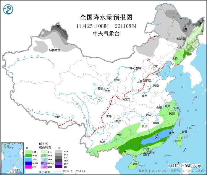 11月24日08時(shí)至25日08時(shí),內(nèi)蒙古東部、東北地區(qū)、新疆沿天山地區(qū)、甘肅河西、川西高原等地部分地區(qū)有小到中雪或雨夾雪,其中,內(nèi)蒙古東北部局地有大雪(5~7毫米)。江南南部、華南大部等地部分地區(qū)有中到大雨,局地暴雨(50~60毫米)。內(nèi)蒙古西部部分地區(qū)有5~7級(jí)風(fēng)(見圖1)。