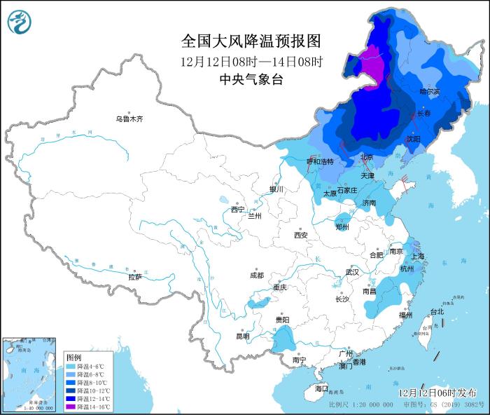 其中,12月12日08時至14日08時,內(nèi)蒙古中東部、東北地區(qū)大部、華北中北部、山東中部、河南北部、江南中東部等地氣溫將下降4~8℃,其中,內(nèi)蒙古東部、河北北部、遼寧西部、吉林西部等地部分地區(qū)降溫幅度可達10℃以上;上述部分地區(qū)并有4~6級偏北風,陣風7~8級。中央氣象臺12月12日06時繼續(xù)發(fā)布大風降溫預報。