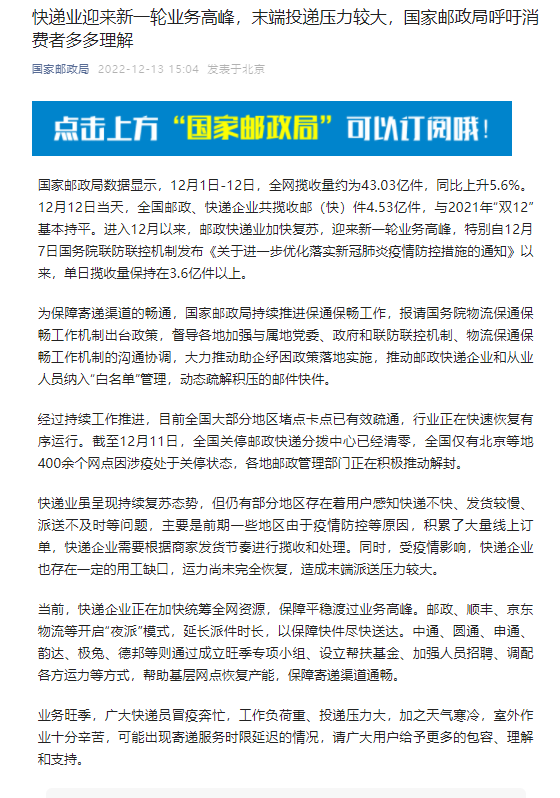 中新網(wǎng)12月13日電 據(jù)“國家郵政局”公眾號13日消息,當(dāng)前,快遞企業(yè)正在加快統(tǒng)籌全網(wǎng)資源,保障平穩(wěn)渡過業(yè)務(wù)高峰。郵政、順豐、京東物流等開啟“夜派”模式,延長派件時(shí)長,以保障快件盡快送達(dá)。中通、圓通、申通、韻達(dá)、極兔、德邦等則通過成立旺季專項(xiàng)小組、設(shè)立幫扶基金、加強(qiáng)人員招聘、調(diào)配各方運(yùn)力等方式,幫助基層網(wǎng)點(diǎn)恢復(fù)產(chǎn)能,保障寄遞渠道通暢。(中新財(cái)經(jīng))