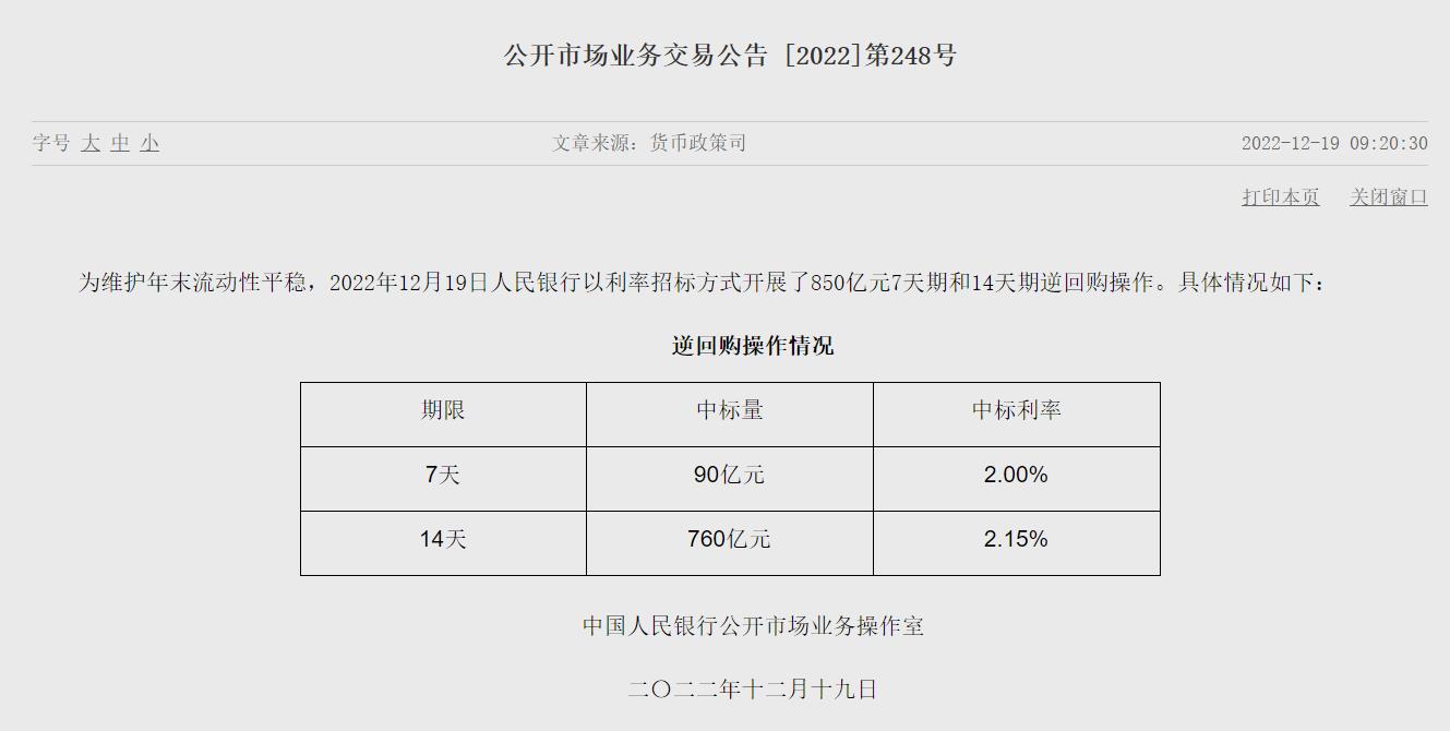 中新網(wǎng)12月19日電 據(jù)央行官網(wǎng)19日消息,為維護年末流動性平穩(wěn),2022年12月19日人民銀行以利率招標(biāo)方式開展了850億元7天期和14天期逆回購操作。(中新財經(jīng))