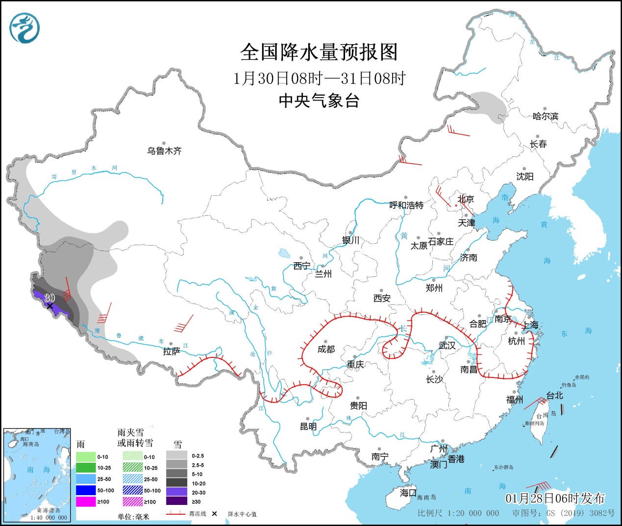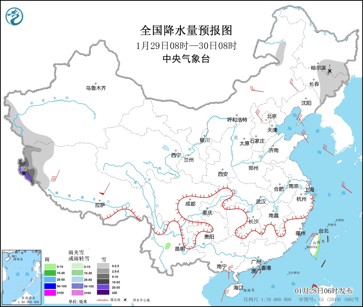 全國(guó)降水量預(yù)報(bào)圖(1月28日08時(shí)-29日08時(shí))。圖片來(lái)源:中央氣象臺(tái)網(wǎng)站